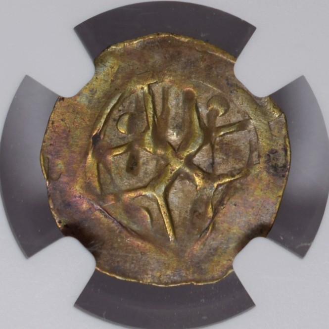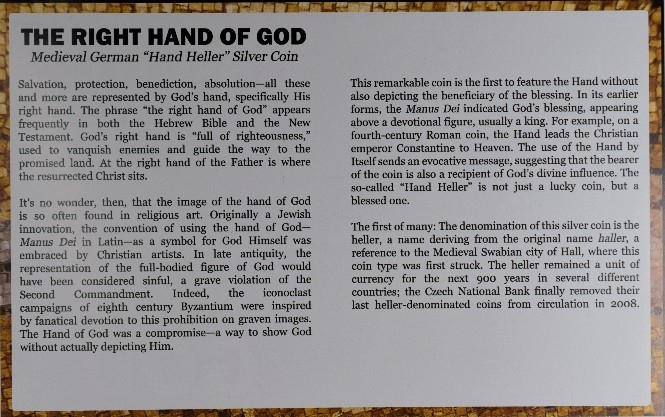 This remarkable coin is the first to feature the hand without also depicting the beneficiary of the blessing. In its earlier forms, the Manus Dei indicated God's blessing, appearing above a devotional figure, usually a king. For example, on a fourth-century Roman coin, the Hand leads the Christian emperor Constantine to Heaven. The use of the Hand by Itself sends an evocative message, suggesting that the bearer of the coin is also a recipient of God's divine influence. The so-called "Hand Heller" is not just a lucky coin, but a blessed one.