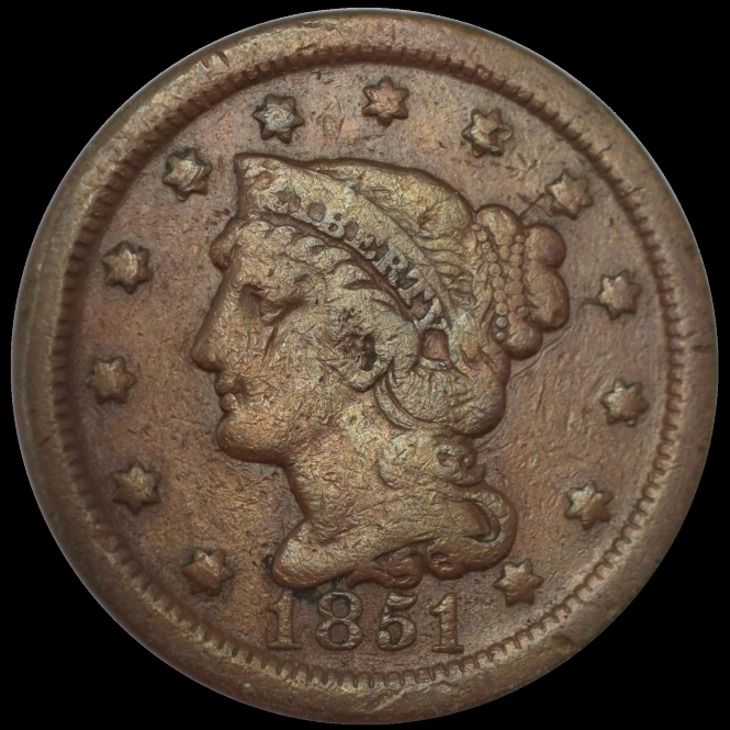 1851 U.S. 1¢ - Liberty Head Braided Hair Large Cent - F+