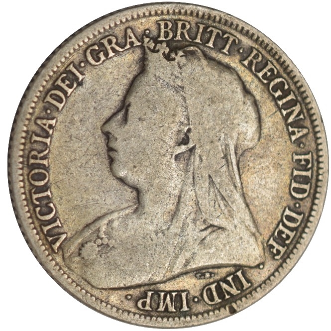 - Obverse: Older veiled bust ('Old Head') of Queen Victoria left, legend around