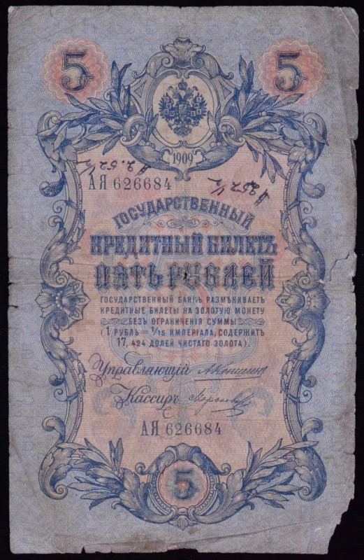 1909 5 Ruble Russia Government Credit Note 626684
