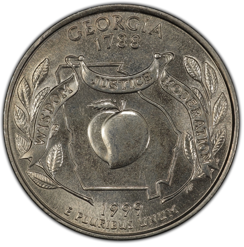 - Reverse: A peach against the state's geographical outline is accompanied with two Live Oak sprigs paying homage to the official state tree, the state's name ("GEORGIA"), the date of its admission into Union ("1788"), its motto "WISDOM JUSTICE MODERATION" on a hanging banner, the motto "E PLURIBUS UNUM" at the bottom and engraver's initials to the right.