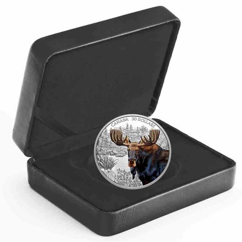 - Reverse: A selectively coloured, close-up view of the moose. The finely engraved backdrop showcases the moose's natural habitat: the boreal forest that stretches across Canada
