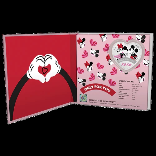 Step into a world where love transcends time and tales become legends, with the 2024 Niue $2 Mickey & Minnie: Love Only For You 1oz Silver Proof coin. This heart-shaped marvel is not just a coin but a celebration of the enchanting romance between Disney's most iconic duo, Mickey Mouse and Minnie Mouse, whose love story has captivated hearts across generations.