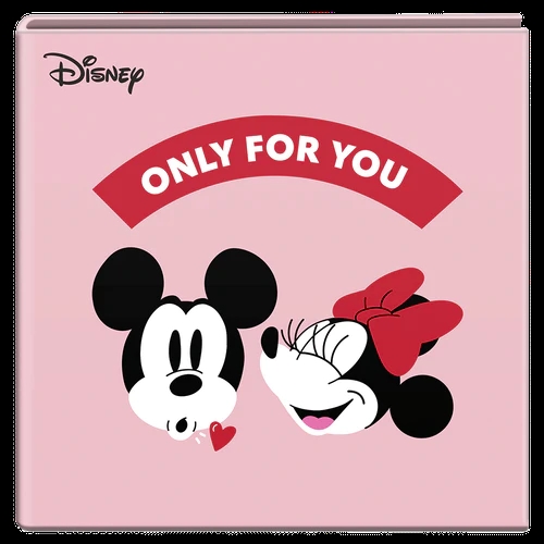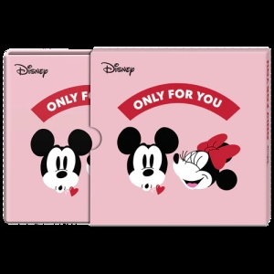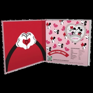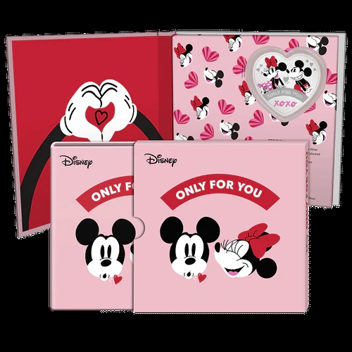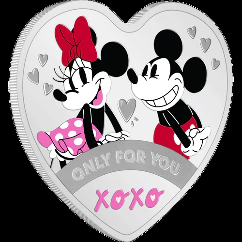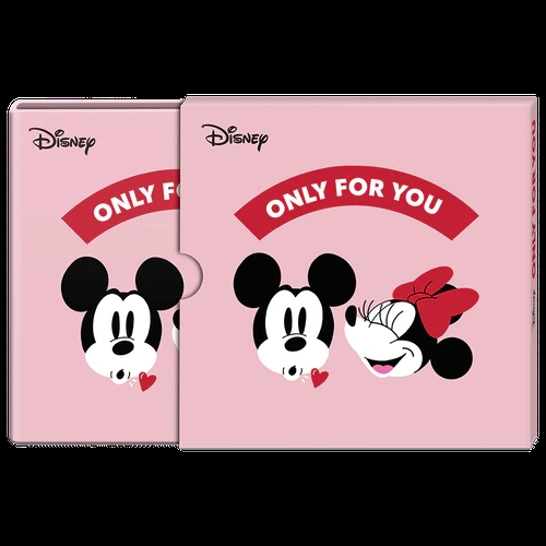 At the heart of this coin is the vibrant depiction of Mickey and Minnie, brought to life in exquisite color, capturing a moment of tenderness and joy that speaks volumes of their timeless bond. The characters are set against a canvas of engraved and frosted love motifs, each element thoughtfully crafted to symbolize the depth and purity of their affection. The phrase 'only for you' encircles the duo, adding a personal touch that resonates with the universal language of love.