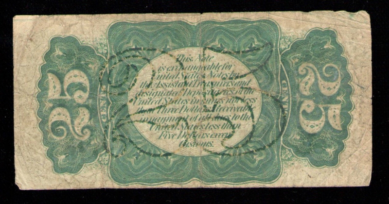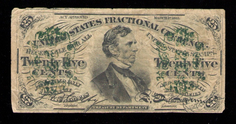 Fractional currency was introduced following the Civil War by the United States federal government. Coins became difficult to find because people started hoarding them for their precious metal content and started using stamps instead of coins as a means of commerce. The government decided to help with the hoarding problem and issue fractional currency or "postage currency". These notes were in use between August 21st 1862 through February 15th 1876. There were 3, 5, 10, 15, 25 and 50 cent denominations with five different issues through this time period. Fractional currency are smaller and do not contain a serial number.