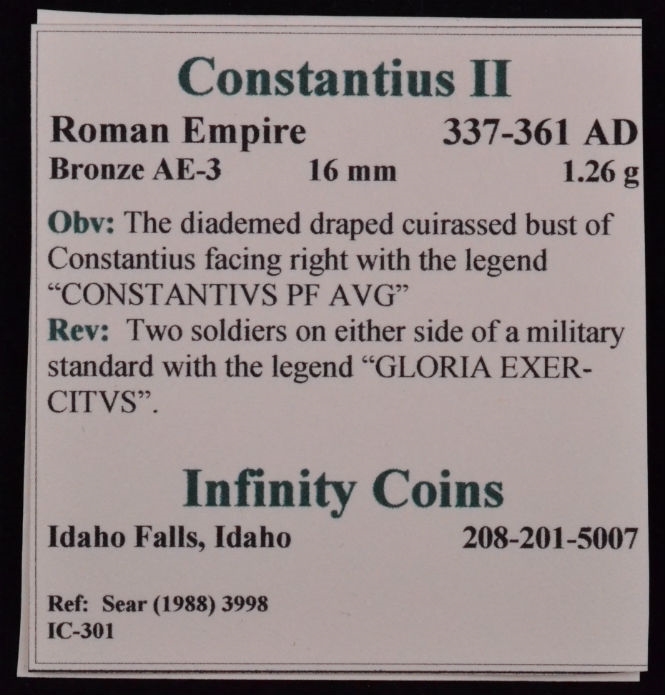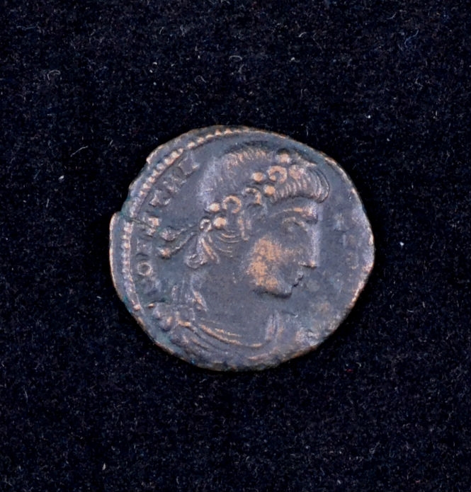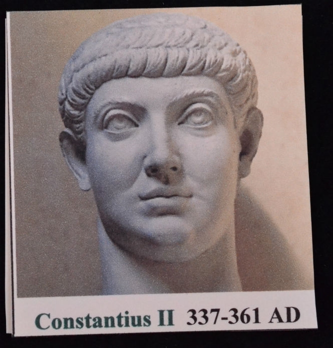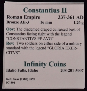 • Obverse: The diademed draped cuirassed bust of Constantius facing right with the legand "DN CONSTANTICVS PF AVG"