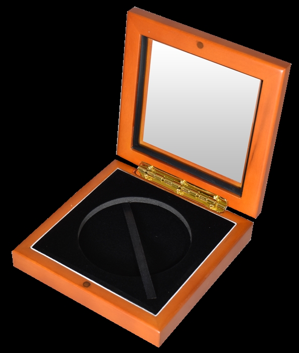 Holds Model Z - Wood box with Glass Top, gold color hinges and magnetic closure.. These boxes are designed to hold model Z Air-tite coin capsules, including the Z-5 for the US Mint America the Beautiful 5 oz coin.