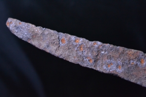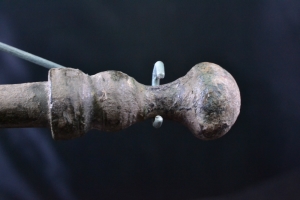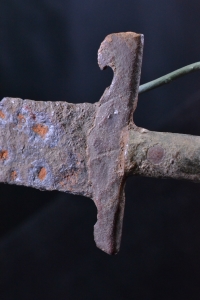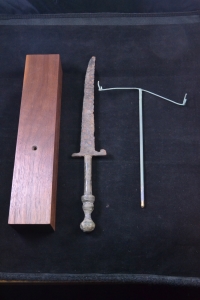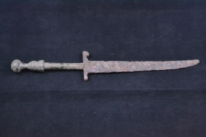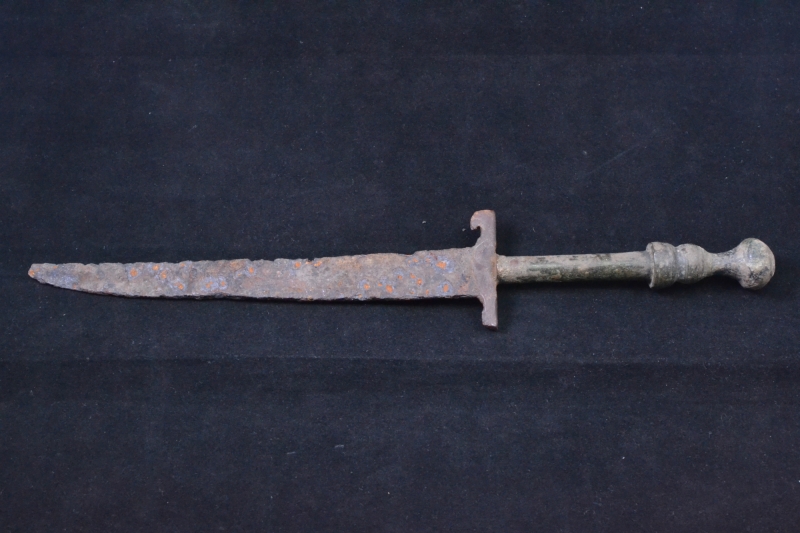 An interesting single edged iron dagger with straight back and long curved edge. The iron blade is fitted into the bronze handle with knobbed pommel.