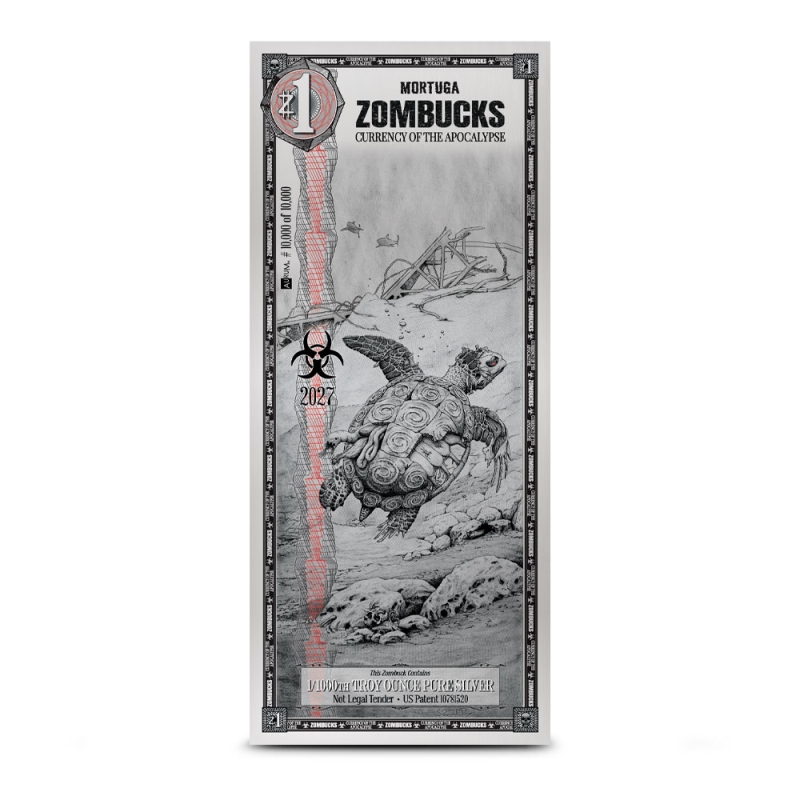 On the obverse of the Silver Zombucks World Mortuga Note, witness the chilling depiction of a zombified hawksbill turtle. Originating from the remote South Pacific, this creature grapples with the effects of the zombie outbreak as its once majestic skin and shell begin to decay amidst the Pacific’s azure waters. The reverse side mirrors the detailed obverse imagery.