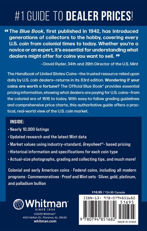 The Handbook of United States Coins—the trusted resource relied upon daily by U.S. coin dealers—returns in its 83rd edition. Wondering if your coins are worth a fortune? The Official Blue Book® provides essential pricing information, showing what dealers are paying for U.S. coins from colonials to modern bullion. With easy-to-follow grading guidelines and comprehensive price charts, this authoritative guide offers a practical, real-world view of the U.S. coin market.